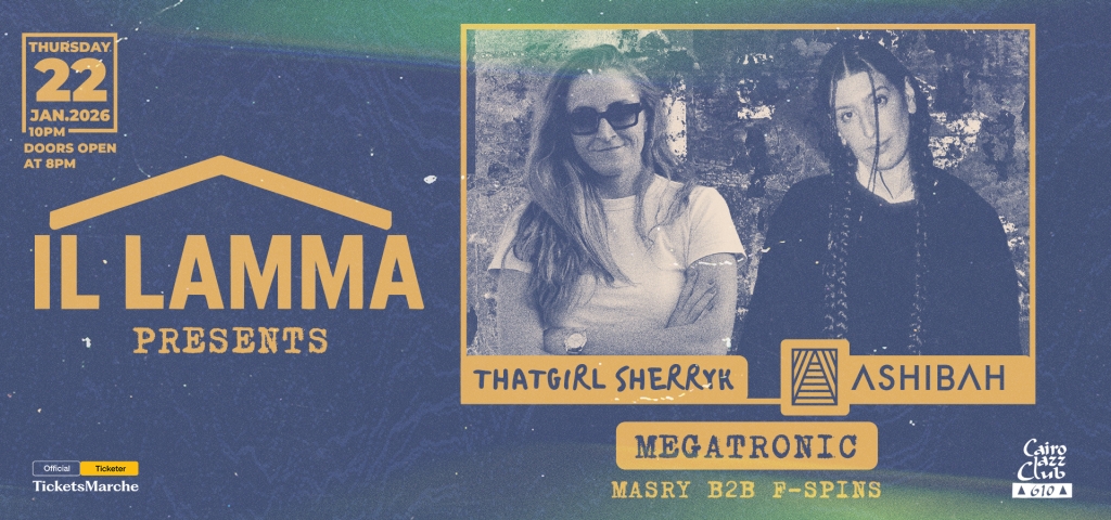 IL Lamma Presents: Sherry K, Ashibah, Megatronic, Masry & F-Spins at Cairo Jazz Club 610 Jan 22 IL Lamma Presents: Sherry K, Ashibah, Megatronic, Masry & F-Spins at Cairo Jazz Club 610 8:00 pm Party